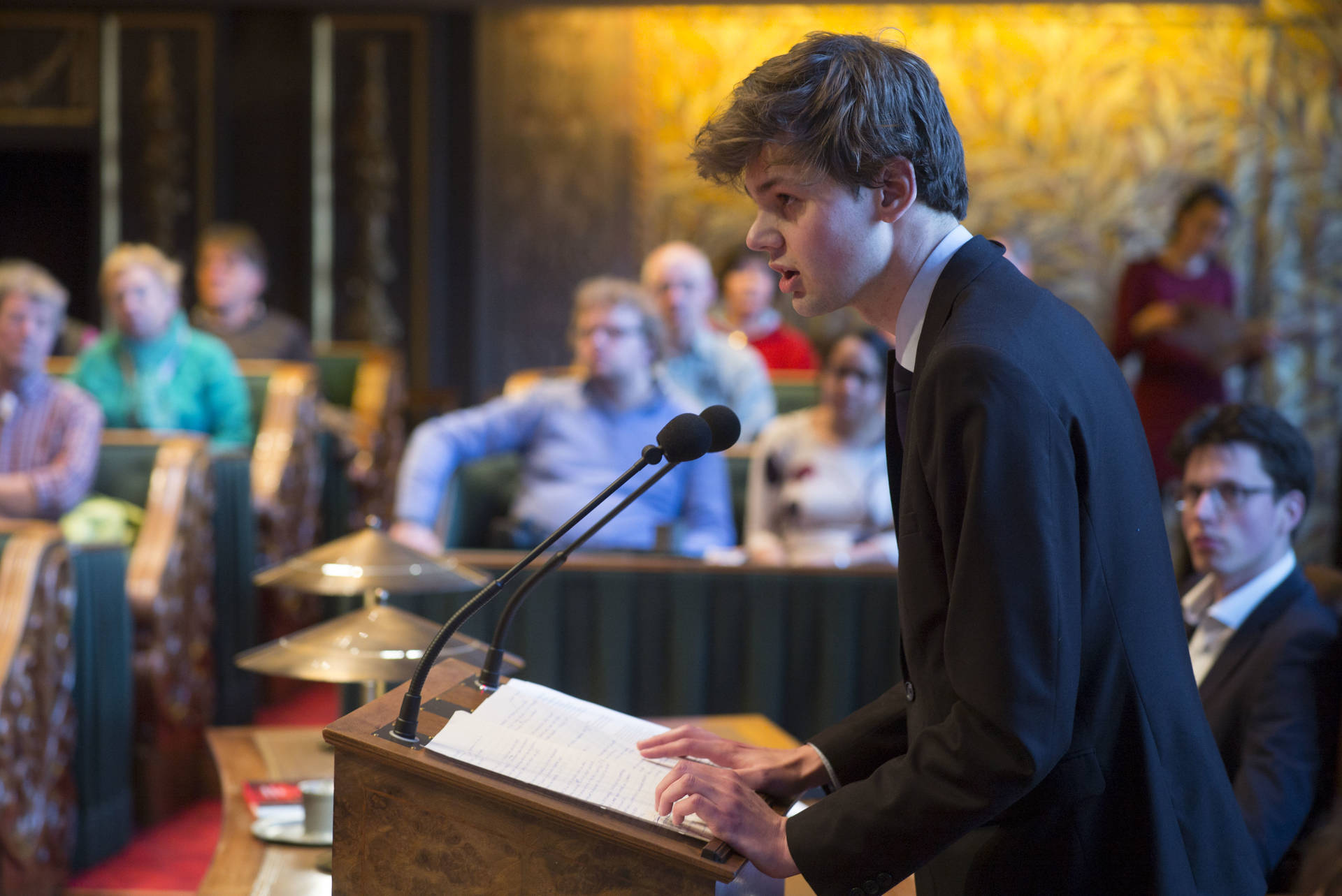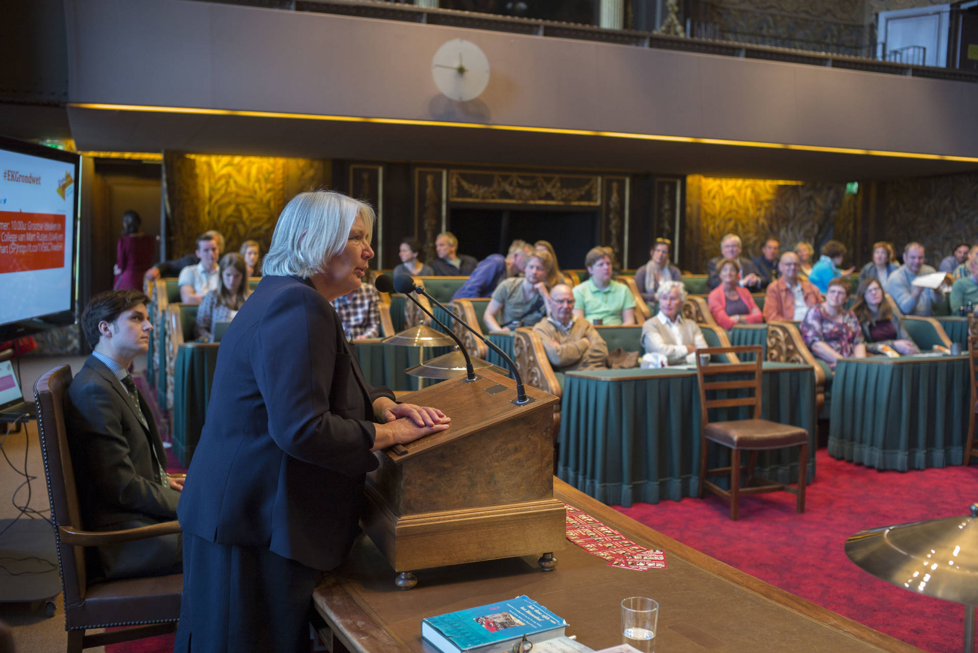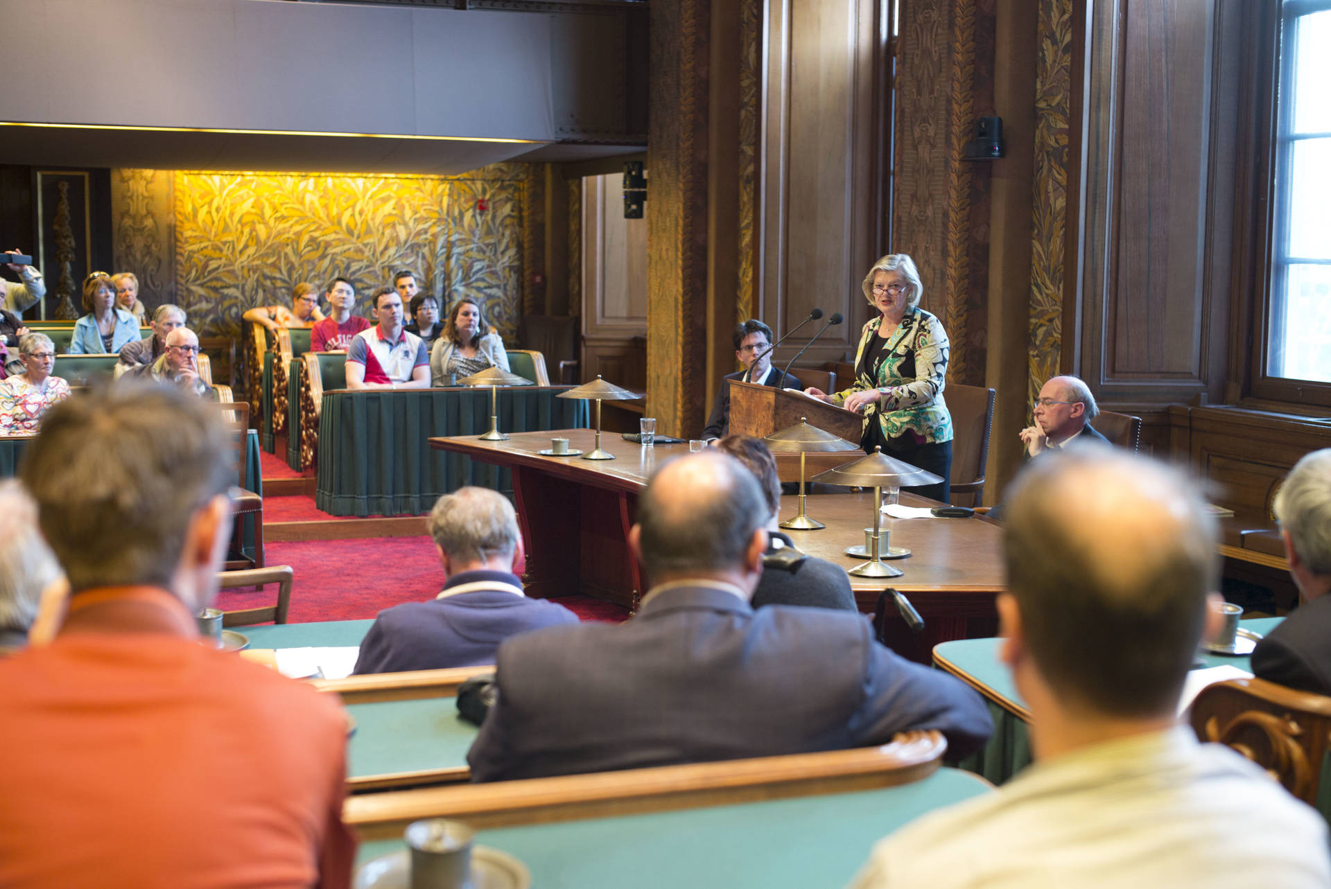 De kunsthistorica Marion Bolten belichtte in het derde college het gebouwencomplex van de Eerste Kamer, ontstaan uit onder meer het Stadhouderlijk kwartier. Zij stond uitvoerig stil bij de uitbundige aankleding van de plenaire vergaderzaal: “De gevel van de Eerste Kamer is dan wel sober, maar architect Pieter Post ‘ging los’ in de plenaire zaal”, aldus Bolten. Griffier Geert Jan Hamilton memoreerde nog dat de ambten die nog altijd aan het Binnenhof zitten een langere voorgeschiedenis hebben dan de 200 jaar van de Grondwet. Op deze geschiedenis mogen wij trots zijn, aldus de Griffier.