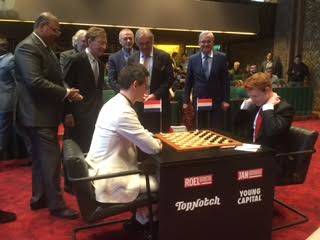 De plenaire zaal van de Eerste Kamer was maandag het bijzondere decor van de achtste partij in de tweekamp om de wereldtitel dammen tussen de Nederlanders Jan Groenendijk en Roel Boomstra. De Ondervoorzitter van de Eerste Kamer Joris Backer heette de spelers en hun begeleiders maandagochtend kort welkom in de Eerste Kamer. Hij zag een parallellie tussen de damsport en het politieke werk dat de Eerste Kamer verricht. Beide vergt reflectie en drie zetten vooruit denken. Hij achtte het passend dat een wedstrijd in deze bijzondere tweekamp in de vergaderzaal van de Chambre de Réflexion werd gespeeld.
