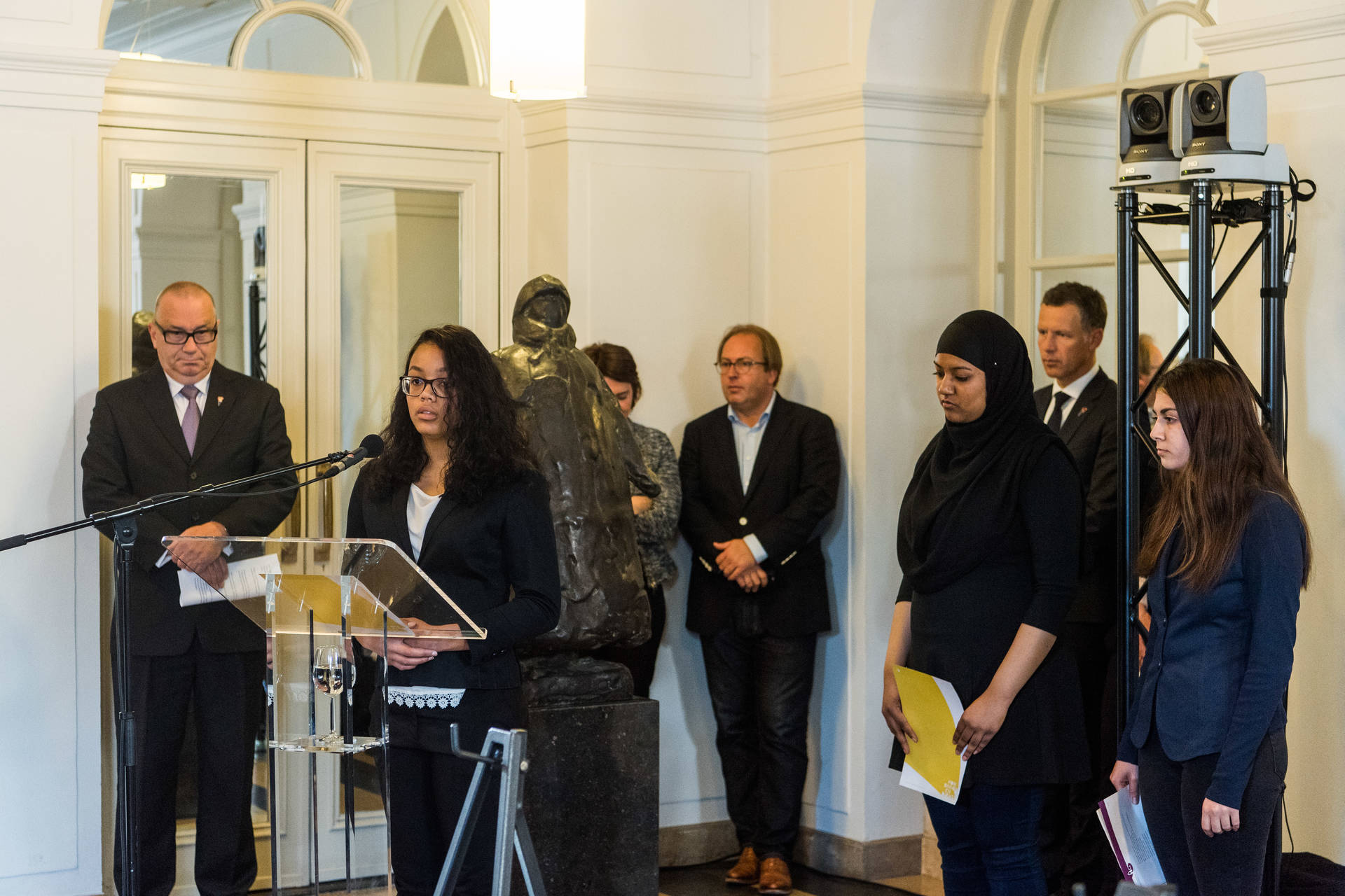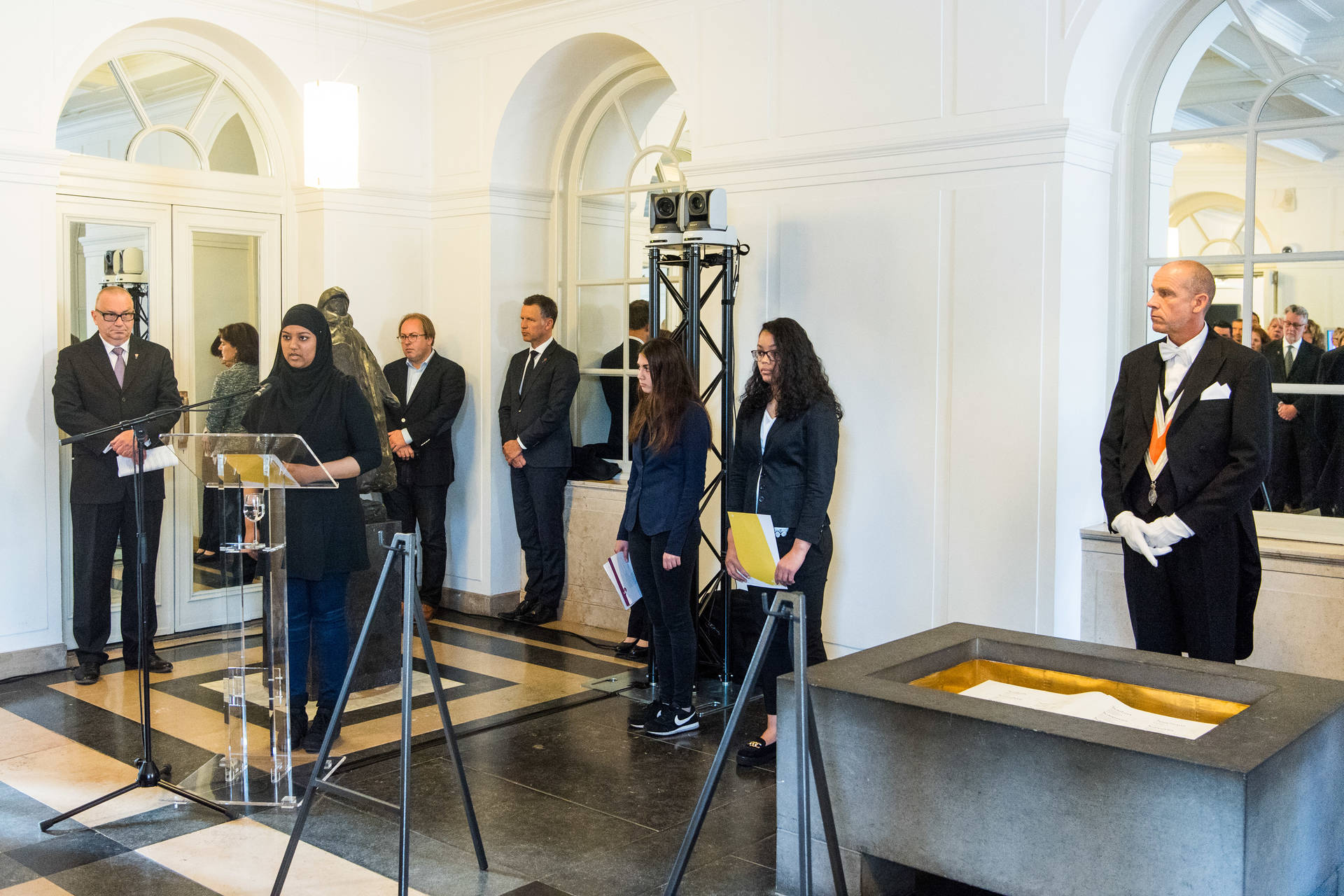 Tijdens de plechtigheid droegen leerlingen van de Haagse Johan de Wittscholengroep zelfgeschreven gedichten voor. Daarna sprak Tweede Kamervoorzitter Khadija Arib over ''het doorgeven van de vrijheid''. Ze wees erop ''dat democratie even mooi als broos is'', en dat het van levensbelang is ''onze waarden uit te dragen in woord en daad''.